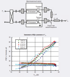 Для систем связи 4-го и 5-го поколений требуются усилители мощности (УМ), обладающие высокой эффективностью в широком частотном диапазоне и совместимые с различными стандартами. В таких системах ввиду увеличенной рабочей полосы и больших объёмов передаваемых данных одним из ключевых параметров сигнала является отношение пикового уровня к среднему (peak-to-average ratio, PAPR), которое характеризует мгновенные отклонения уровня передаваемой мощности от среднего значения. В связи с этим в усилителе важно обеспечить высокое значение КПД не только при максимальном уровне выходной мощности, но и при меньших значениях – обычно при 6 дБ до максимума – во всей рабочей полосе. В данной статье описывается инновационный проект усилителя Догерти на основе 200 Вт нитридных HEMTтранзисторов, обеспечивающего средний КПД до 50–60% с выходной мощностью до 100 Вт и позволяющего значительно уменьшить размеры, стоимость и уровень потребляемой мощности передатчика. Авторы проекта использовали программное обеспечение NI AWR Design Environment и, в частности, его модуль схемотехнического проектирования Microwave Office