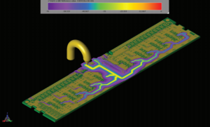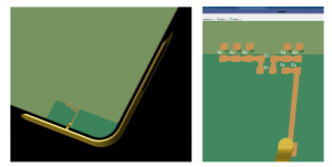 A simple antenna for LTE band operation is added to the PC board of a smartphone in XFdtd and the matching circuit is tuned for operation in multiple frequency bands. The components in the matching network are chosen to maximize system efficiency. Figure 1 shows the antenna being used, which is a simple strip fed off center. It can be thought of as two back-to-back inverted L antennas of different “top” lengths, though the operating modes are more complicated than that. Figure 2 shows system efficiency for this antenna when fed directly and demonstrates that matching is required to improve performance.